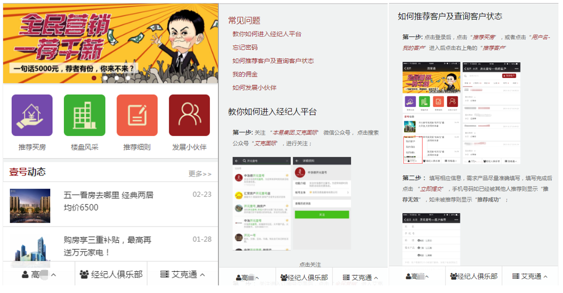 客戶注冊:擁有微信并關注公眾號,即可注冊申請成為全民營銷系統(tǒng)的用戶(全民經(jīng)紀人)。注冊用戶可隨時通過微信查看已經(jīng)推薦的客戶信息、購房進度、傭金結算情況。