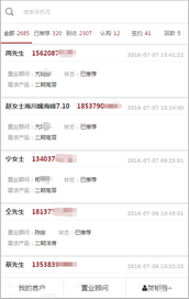 客戶信息審核:置業(yè)顧問在微信端接收到推送過來的客戶數(shù)據(jù),可根據(jù)設置的模式獲得客戶數(shù)據(jù),也可進行搶單,將客戶變?yōu)樽约旱母M客戶,進行客戶信息的初步審核。