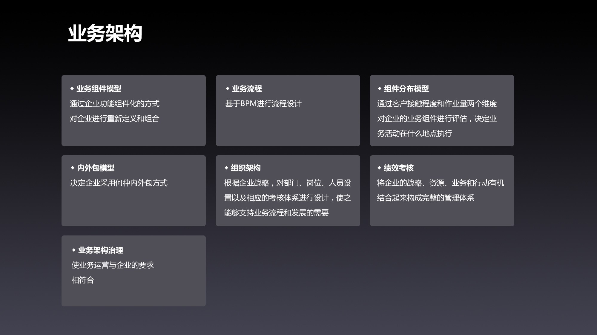 基于BPM設計業(yè)務流程,結合管理層ARC - ERP系統(tǒng)與“樞理”數(shù)據(jù)治理,梳理、優(yōu)化流程,消除冗余環(huán)節(jié),提升運轉效率;借組件分布模型,從客戶接觸程度和作業(yè)量維度,評估業(yè)務組件,合理規(guī)劃業(yè)務活動執(zhí)行地點,降低運營成本;以內外包模型,科學決策業(yè)務外包方式,聚焦核心競爭力;依據(jù)戰(zhàn)略設計組織架構,適配部門、崗位、人員及考核體系,為業(yè)務流程筑牢組織支撐;通過績效考核,串聯(lián)戰(zhàn)略、資源、業(yè)務與行動,構建完整管理體系;依托業(yè)務架構治理,確保業(yè)務運營貼合企業(yè)要求,讓戰(zhàn)略落地“看得見、摸得著”。